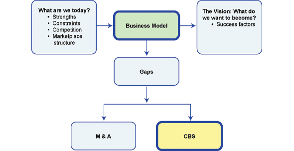 One of the most interesting things about going through this iterative process is that gaps in our ability to bring what is necessary for a given Business Model and Vision are immediately apparent. The gaps are sometimes insurmountable, and the corresponding Vision must be abandoned. However, there will be other times when the gaps can be filled through collaboration with another company, through a partnership, joint venture, licensing agreement, etc. The Chesterfield Group uses the term Collaborative Business Structures (CBS) to describe these structures as a group. This realization has led the Chesterfield Group to its second major focus, the recognition, structuring and deployment of Collaborative Business Structures. The picture below will help to place CBS in the context of our previous discussion of Business Models. Please note that mergers and acquisitions are also shown, since they are a common response to Business Model gaps, and also to make it clear that CBS should be seen as alternative to M&A in that respect.